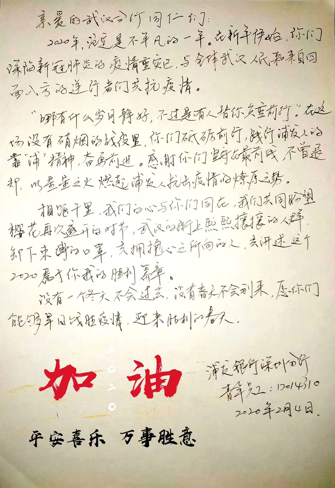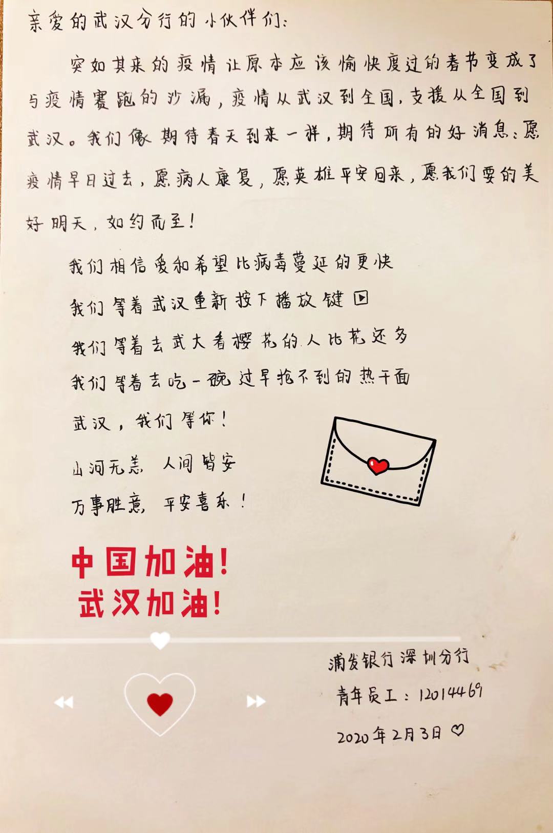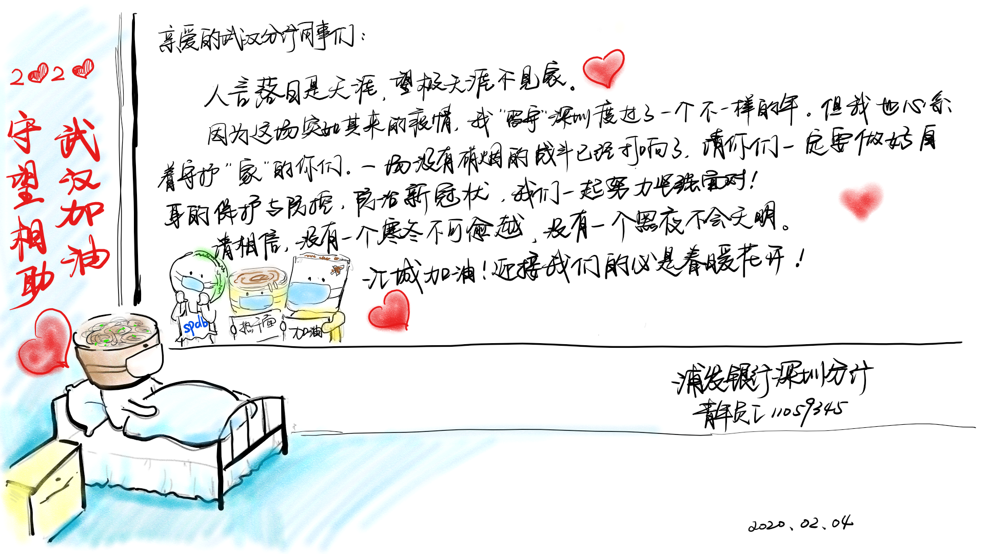 2月3日,浦發(fā)銀行深圳分行團委向全體青年員工發(fā)出了一封倡議書。在倡議書中,該行團委號召廣大團干部、團員青年立即行動,充分發(fā)揮黨的助手和后備軍作用,展現(xiàn)青年突擊隊作為,為堅決打贏疫情防控阻擊戰(zhàn)貢獻力量,并向青年提出三個要求:“堅定信心不迷茫,聽黨指揮勇?lián)?dāng)”、“科學(xué)防范不信謠,眾志成城控疫情”、“居家辦公不離崗,服從指揮勇?lián)?dāng)”。當(dāng)日,浦發(fā)銀行深圳分行發(fā)起了給武漢分行同事寄送家書的活動,該行全體青年手寫家書,圖文并茂、紙短情長,表達了對疫區(qū)“戰(zhàn)友們”最深切的關(guān)愛和鼓勵,身體力行做好他們堅強的后盾。