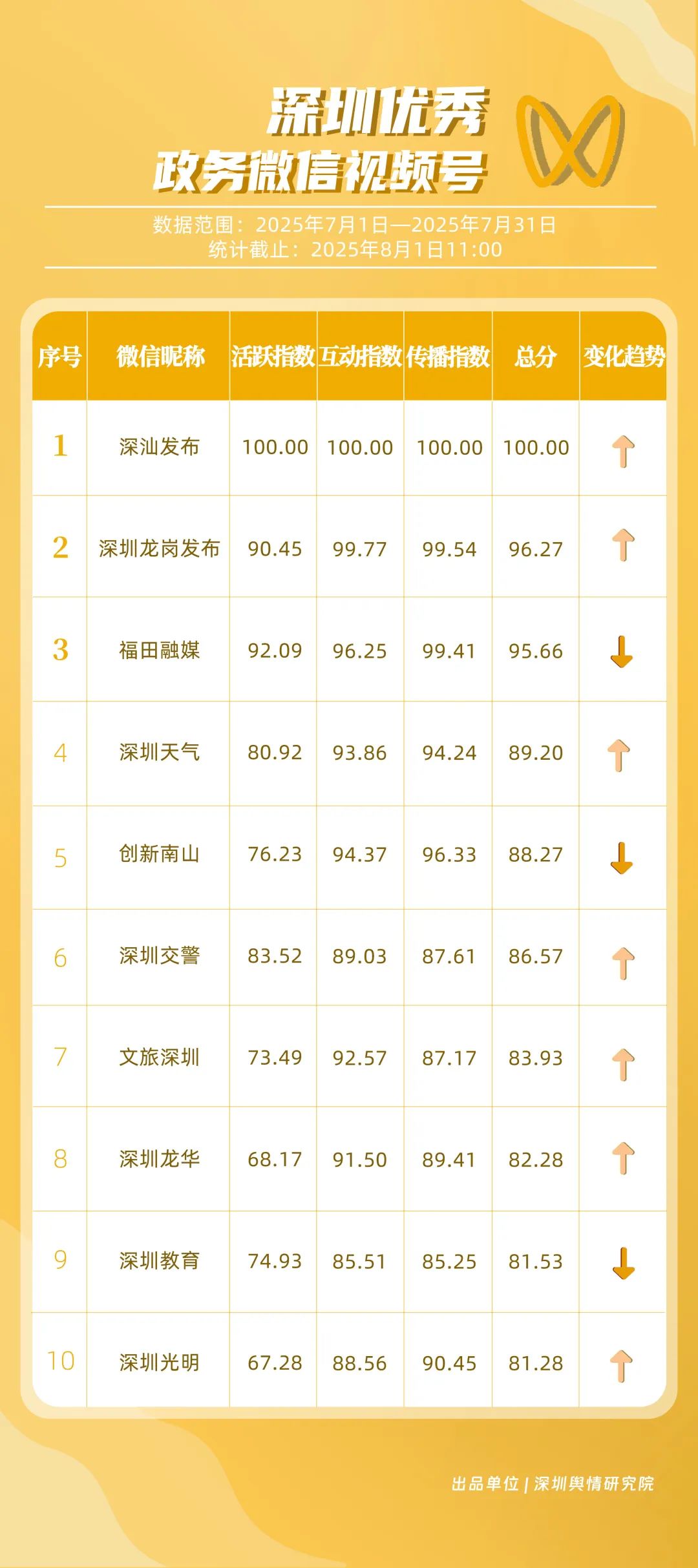 7月,獲得“深圳優(yōu)秀政務微信視頻號”稱號的是“深汕發(fā)布”“深圳龍崗發(fā)布”“福田融媒”“深圳天氣”“創(chuàng)新南山”“深圳交警”“文旅深圳”“深圳龍華”“深圳教育”“深圳光明”。其中,“深汕發(fā)布”持續(xù)輸出熱點內(nèi)容,收獲大量網(wǎng)民關(guān)注、互動,三項指標均達滿分,位居榜首;“深圳龍崗發(fā)布”“福田融媒”緊隨其后,總分均超過95分,兩賬號通過多樣化的內(nèi)容呈現(xiàn),在活躍、互動及傳播等方面均有出色表現(xiàn);“深圳天氣”“創(chuàng)新南山”“深圳交警”等賬號也獲得不錯成績,總分均在85分以上。上榜微信視頻號精準把握平臺特性,高效傳遞了政務信息,更成為展現(xiàn)城市活力、拉近政府與民眾距離的重要窗口。