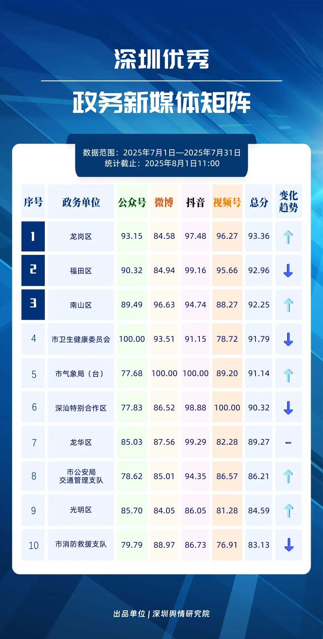 7月,深圳政務新媒體矩陣各展所長,為市民帶來豐富實用的信息服務。龍崗區(qū)、福田區(qū)、南山區(qū)、市衛(wèi)生健康委員會、市氣象局(臺)、深汕特別合作區(qū)、龍華區(qū)、市公安局交通管理支隊、光明區(qū)、市消防救援支隊的新媒體矩陣入選“深圳優(yōu)秀政務新媒體矩陣”榜單。值得關(guān)注的是,龍崗區(qū)新媒體矩陣在7月著力提升內(nèi)容質(zhì)量,于抖音和微信視頻號平臺得分顯著提高,成功登頂;福田區(qū)新媒體矩陣在抖音平臺表現(xiàn)突出,位列榜單第二;南山區(qū)新媒體矩陣則在微博和抖音平臺保持評分優(yōu)勢。此外,市氣象局(臺)、市公安局交通管理支隊和光明區(qū)的排名也實現(xiàn)明顯上升,體現(xiàn)出政務新媒體矩陣整體競爭力持續(xù)增強。