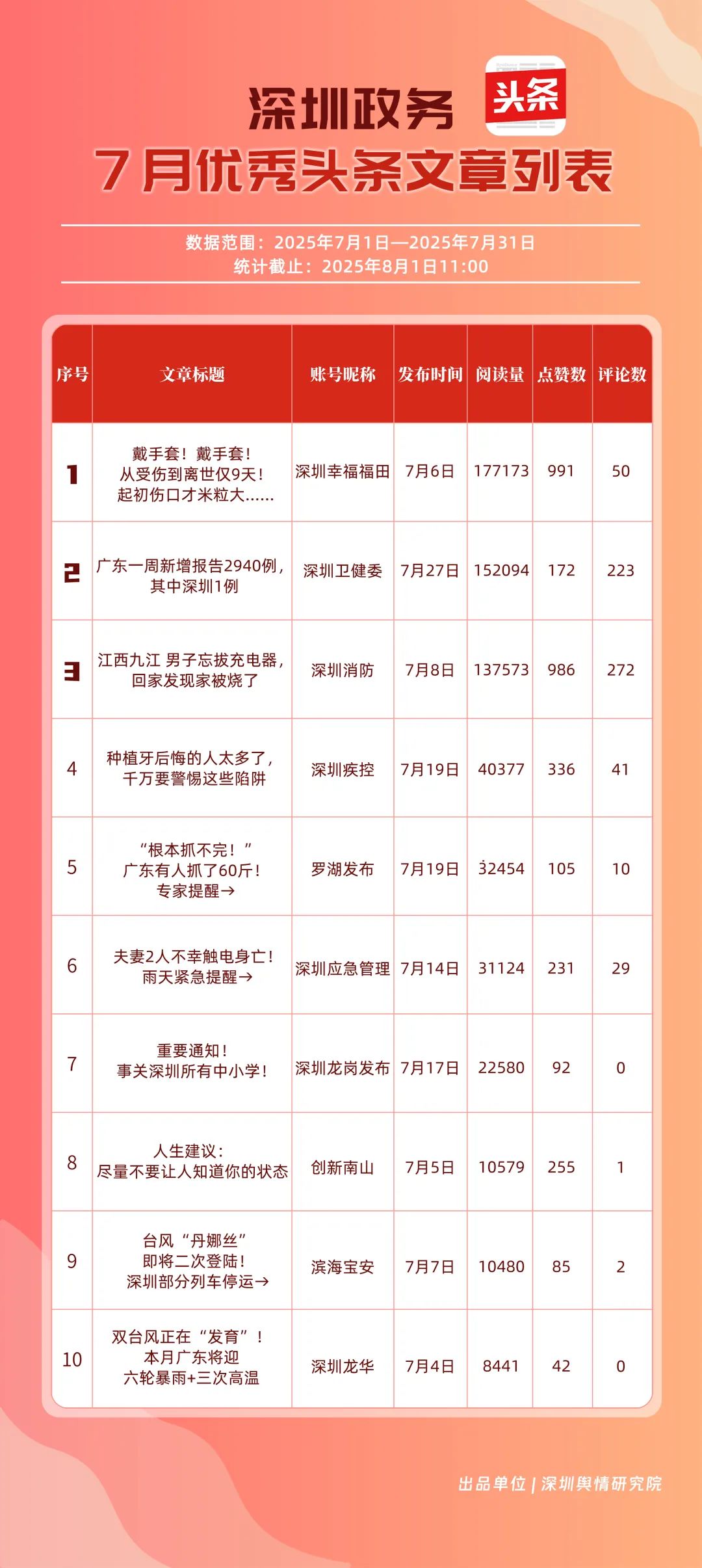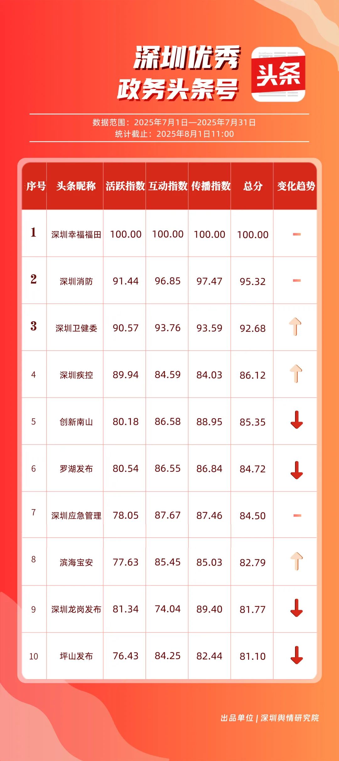 7月,“深圳幸福福田”“深圳消防”“深圳衛(wèi)健委”“深圳疾控”“創(chuàng)新南山”“羅湖發(fā)布”“深圳應急管理”“濱海寶安”“深圳龍崗發(fā)布”“坪山發(fā)布”共10個政務頭條號入選“優(yōu)秀政務頭條號”榜單?!吧钲谛腋8L铩薄吧钲谙馈睉{借優(yōu)質(zhì)內(nèi)容持續(xù)吸引用戶關(guān)注,穩(wěn)居前二;“深圳衛(wèi)健委”表現(xiàn)亮眼,評分達92.68分,排名較6月有所上升;“深圳疾控”同樣進步明顯,在疾病預防控制信息傳播上發(fā)揮了重要作用?!皠?chuàng)新南山”“羅湖發(fā)布”“深圳應急管理”等上榜賬號,也各展所長,始終將優(yōu)質(zhì)內(nèi)容作為核心抓手,成為政務新媒體領域內(nèi)容創(chuàng)作與傳播的典范。