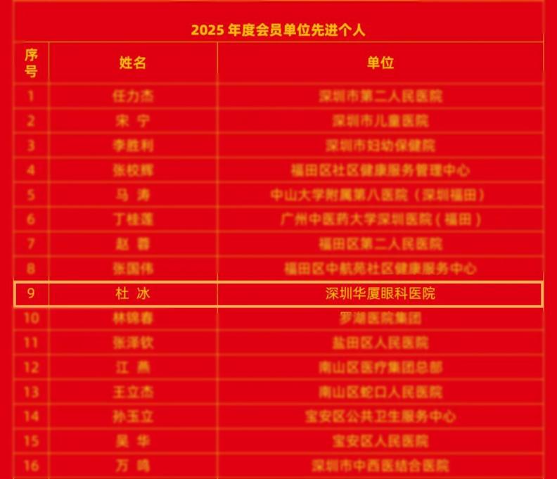 深圳新聞網(wǎng)2026年1月29日訊(記者 林恒鑫)1月27日,深圳市社區(qū)衛(wèi)生協(xié)會(huì)公布了2025年度優(yōu)秀分支機(jī)構(gòu)及先進(jìn)個(gè)人名單,深圳華廈眼科醫(yī)院副院長(zhǎng)杜冰教授因在社康眼健康服務(wù)中的突出表現(xiàn),榮獲“2025年度會(huì)員單位先進(jìn)個(gè)人”稱(chēng)號(hào)。