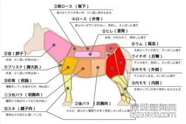馬能做成刺身的部位相當?shù)挠邢蓿勒沼突ǚ植即笾驴梢苑譃楦谷?卜口)、霜降、赤身等不同的等級。其中最稀有的的“三枚腹”肉,一匹五百公斤的馬只能產(chǎn)出大約5-6公斤,肉質(zhì)口感近似于藍鰭金槍魚中腹肉。