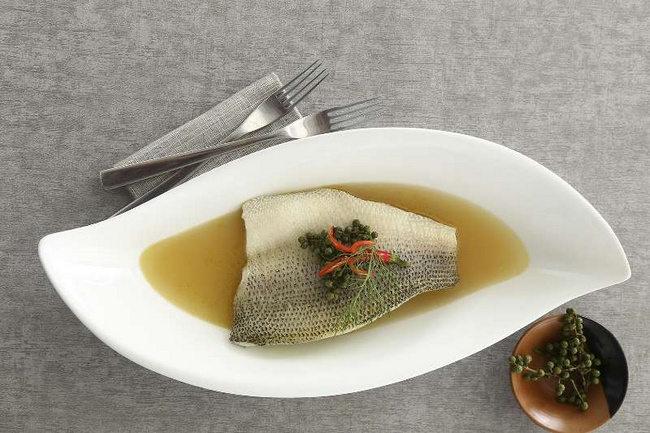 區(qū)別于充斥著辣椒與熱油的傳統(tǒng)水煮魚(yú),梧桐 PLUS 的 fusion水煮魚(yú)外表清新,口感麻辣。食材選用三斤左右的上等淡水鱸魚(yú),清晨宰殺,剔骨后整場(chǎng)取肉,再經(jīng)過(guò)高溫蒸制,保證魚(yú)肉肉質(zhì)嫩滑松軟。并不像傳統(tǒng)的水煮魚(yú)采用的“湯菜”的方式,fusion水煮魚(yú)采用肉料分離的烹飪方式。魚(yú)湯經(jīng)過(guò)麻椒、辣椒的熬煮而變得味道濃郁,過(guò)濾后僅留清爽的湯汁,單從視覺(jué)上根本無(wú)法判斷蘊(yùn)藏的奇妙味道,這也正是這道招牌菜的精妙之處。盛盤(pán)后的fusion 水煮魚(yú)猶如一道藝術(shù)品,造型簡(jiǎn)約充滿(mǎn)意境,清亮的魚(yú)湯入口瞬間酸辣感通透口腔,脫離了紅油浸泡的濃郁麻辣口感,更加健康養(yǎng)生。