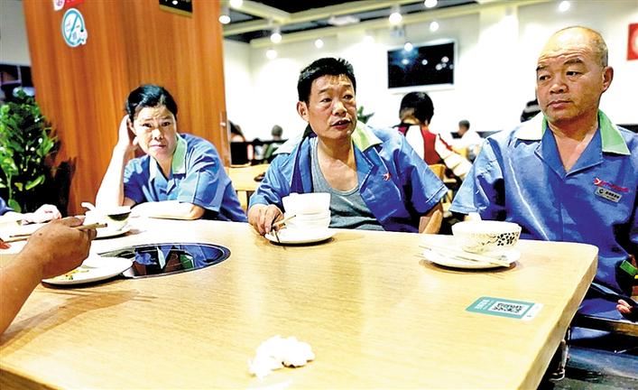 在店里吃飯的人群里,有一張臺(tái)全是清一色的藍(lán)色工作服,特別顯眼?!拔覀兠刻於紩?huì)來這里吃早餐,差不多有一年時(shí)間了,這里的老板太好了,希望他能一直開下去。”這幾個(gè)大叔、大嬸是周邊物業(yè)的清潔工人,他們每天早上5點(diǎn)鐘就上崗工作,忙完就到了6-7點(diǎn),又餓又累,有一碗熱騰騰的早餐是一件非常幸福的事,而這種開心快樂的事情在這里發(fā)生了。吳姓清潔工說,這里的老板和員工很好,大家來這里吃粥,沒有感到半點(diǎn)不自在,就像在自己家一樣。