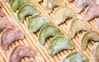 菠菜榨汁與面粉均勻拌成面團醒發(fā)十分鐘;肉末加上蝦仁丁、香菇粒、胡蘿卜粒、鹽、雞精、糖拌勻,即可包百菜餃。