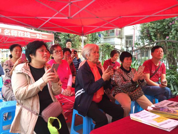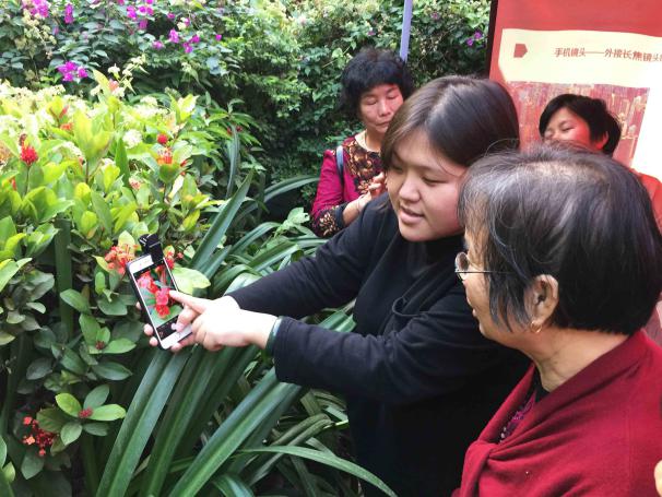 市民們?cè)谥v解員指導(dǎo)下練習(xí)手機(jī)攝影