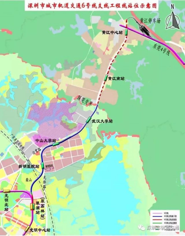 深圳地鐵6號線支線位于深圳市光明區(qū),起點(diǎn)設(shè)在6號線翠湖站東側(cè)(翠湖站為兩線換乘車站)、終點(diǎn)位于公常路深莞邊界,連接光明中心區(qū)和光明北區(qū)、中山大學(xué),與規(guī)劃建設(shè)的東莞1號線南延線銜接,包括4站4區(qū)間:翠湖站(原荔林站)、新明醫(yī)院站、中山大學(xué)站、武漢大學(xué)站。