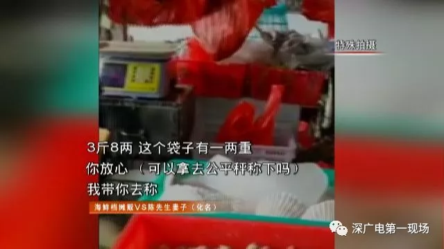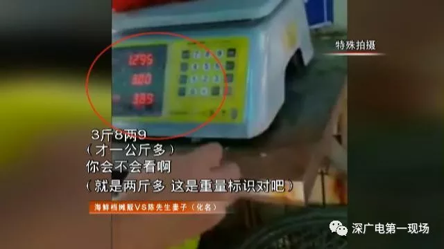 第二天中午,記者以消費者的身份,陪同陳先生夫妻倆,再次來到福永海鮮市場,購買海鮮的海鮮檔,商家介紹,這都是新鮮澳洲龍蝦,價格實惠,童叟無欺。這位海鮮檔攤販熱情的給記者挑選了一只澳洲龍蝦,放在自己攤檔的電子秤上稱重,加上塑料袋,大概是3斤8兩,這時陳先生妻子要求,海鮮檔老板到市場公平秤上進行稱重。