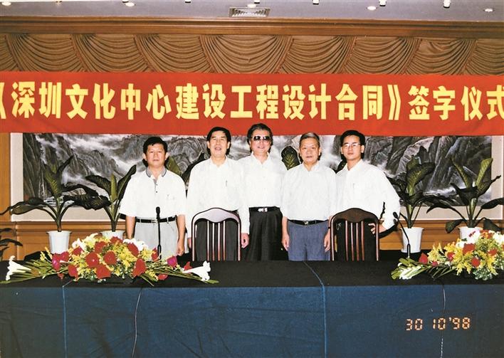 譚嗣英(左三)出席《深圳文化中心建設(shè)工程設(shè)計合同》簽字儀式。