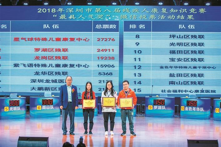 ▲2018深圳市第八屆殘疾人康復知識競賽,王堅為獲獎單位代表頒獎。