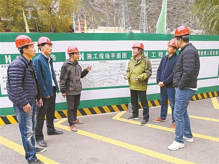 2017年12月蔡明(左四)在武漢高新大道現(xiàn)場(chǎng)查看工程進(jìn)度。