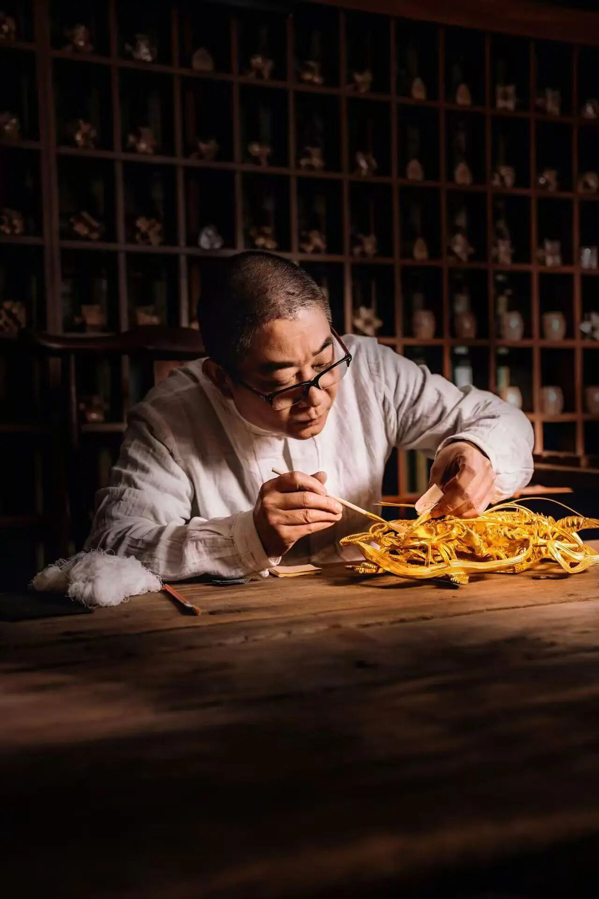 丁全的技藝啟蒙源于家族,作為“甲子金漆木雕”的傳人,他從小耳濡目染。1987年,16歲的他帶著一身木工本領(lǐng)來到蓬勃發(fā)展的深圳,從裝飾公司的技術(shù)工做起,親身參與了“深圳速度”的代表工程,在實踐中將傳統(tǒng)手藝與現(xiàn)代建筑需求相融合。