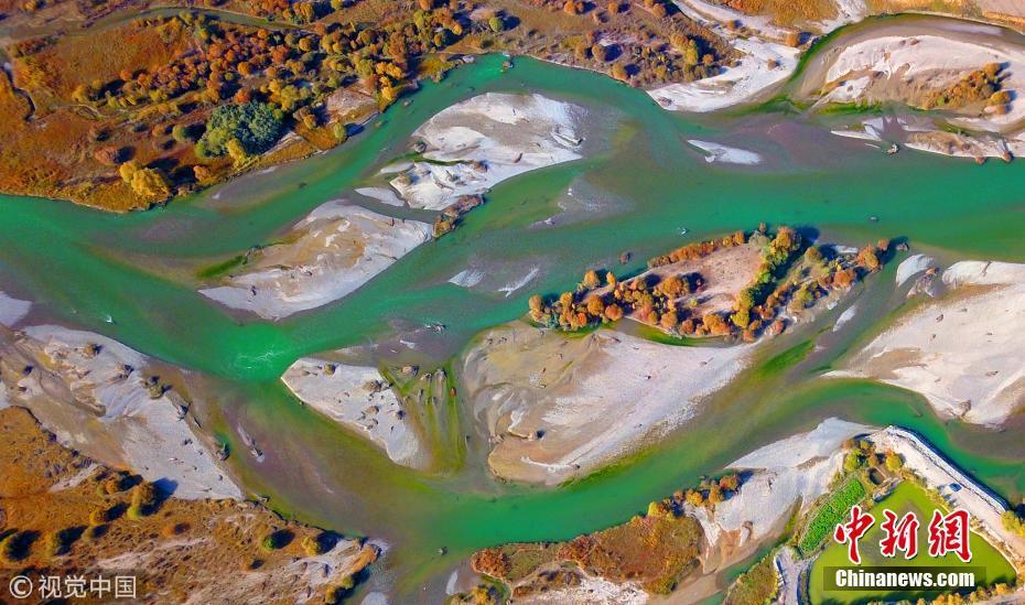 10月5日,新疆巴音郭楞,流過新疆和靜縣巴潤(rùn)哈爾莫敦鎮(zhèn)的開都河秋景(無人機(jī)拍攝)。 圖片來源:視覺中國