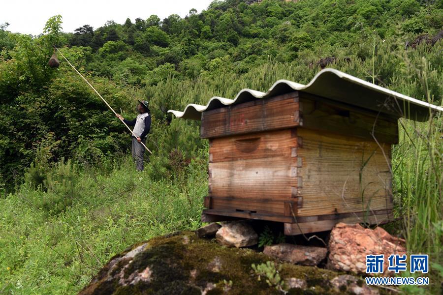 5月10日,在甘肅省隴南市徽縣大河店鎮(zhèn)硬灣村,蜂農(nóng)周仲頤在收蜂。 甘肅省隴南市徽縣大河店鎮(zhèn)硬灣村位于秦巴山區(qū)深處,2017年,在當?shù)卣姆龀窒?,龍崖老巢蜜養(yǎng)殖農(nóng)民專業(yè)合作社成立,蜂農(nóng)們將傳統(tǒng)養(yǎng)蜂技藝和現(xiàn)代加工方式相結合,并通過電商等渠道打開銷路,有效帶動了當?shù)刎毨Т迕衩撠氈赂弧D壳罢麄€合作社共有蜂箱2000余個,每箱每年可帶來三四千元的收入。 新華社記者 馬寧 攝