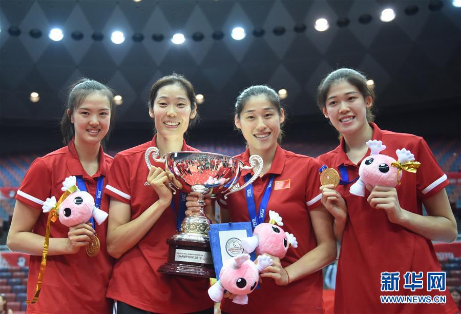 9月29日,中國隊(duì)球員張常寧、朱婷、劉曉彤、李盈瑩(從左至右)在頒獎儀式上合影。新華社記者賀燦鈴攝