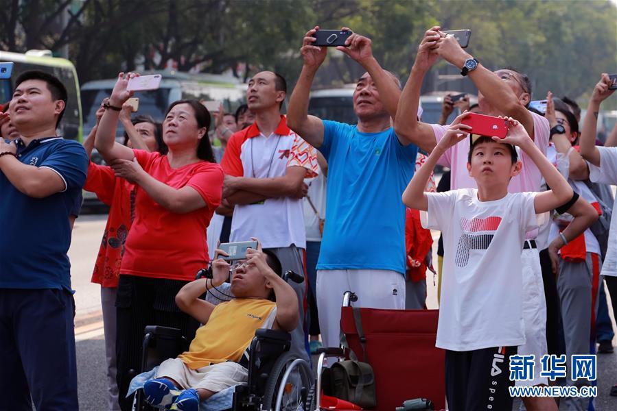 10月1日,市民在北京南新華街拍攝飛過(guò)北京上空的受閱飛機(jī)。當(dāng)日是國(guó)慶節(jié),全國(guó)各地的人們用各種方式歡度節(jié)日。新華社記者 薛東梅 攝