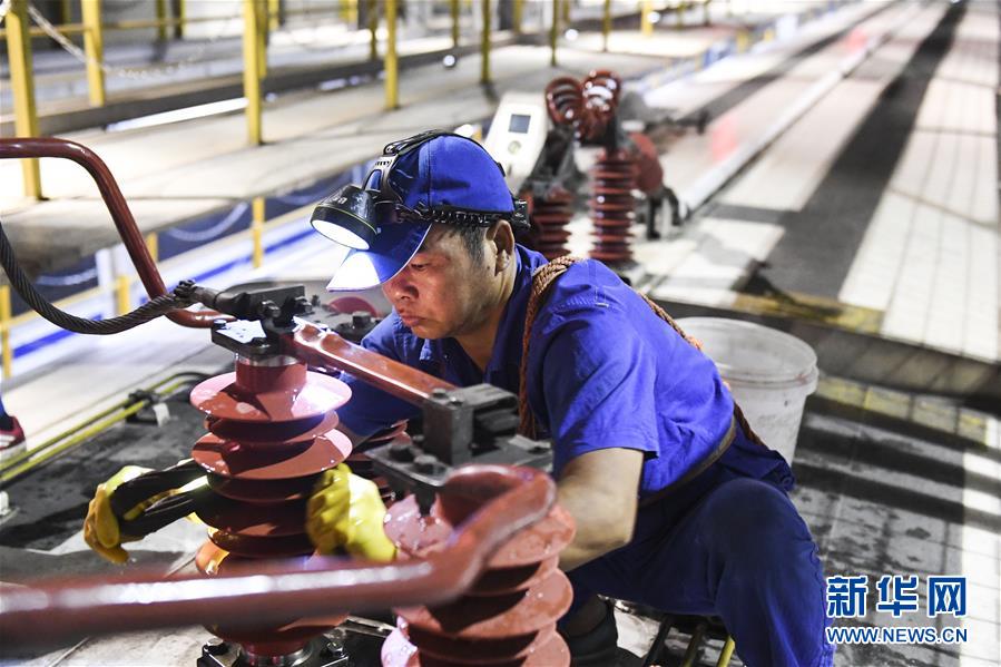 工人在擦洗車頂絕緣子(10月2日攝)。 新華社記者 曹祎銘 攝