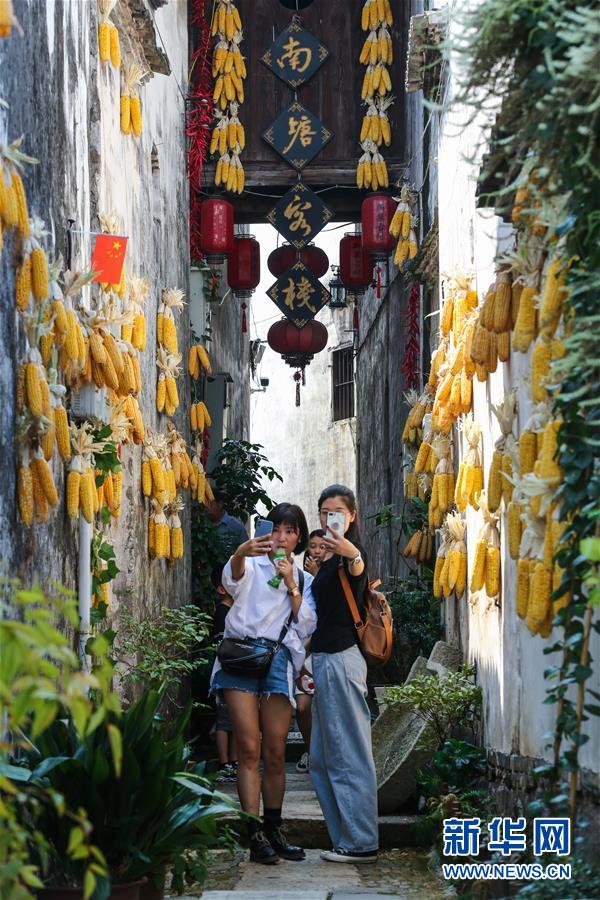 10月5日,游客在新葉古村的巷子內(nèi),拍攝“曬秋”美景。新華社記者徐昱攝