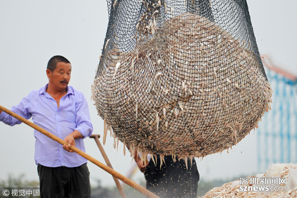 渤海灣畔海產(chǎn)豐收,成群魚蝦分揀后當(dāng)街晾曬,場面賽曬糧食