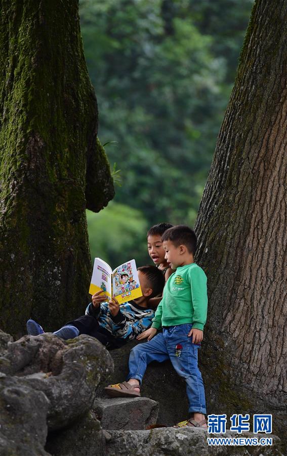黔桂烏英苗寨的孩子們?cè)陂喿x剛剛獲贈(zèng)的圖書(shū)(10月11日攝)。