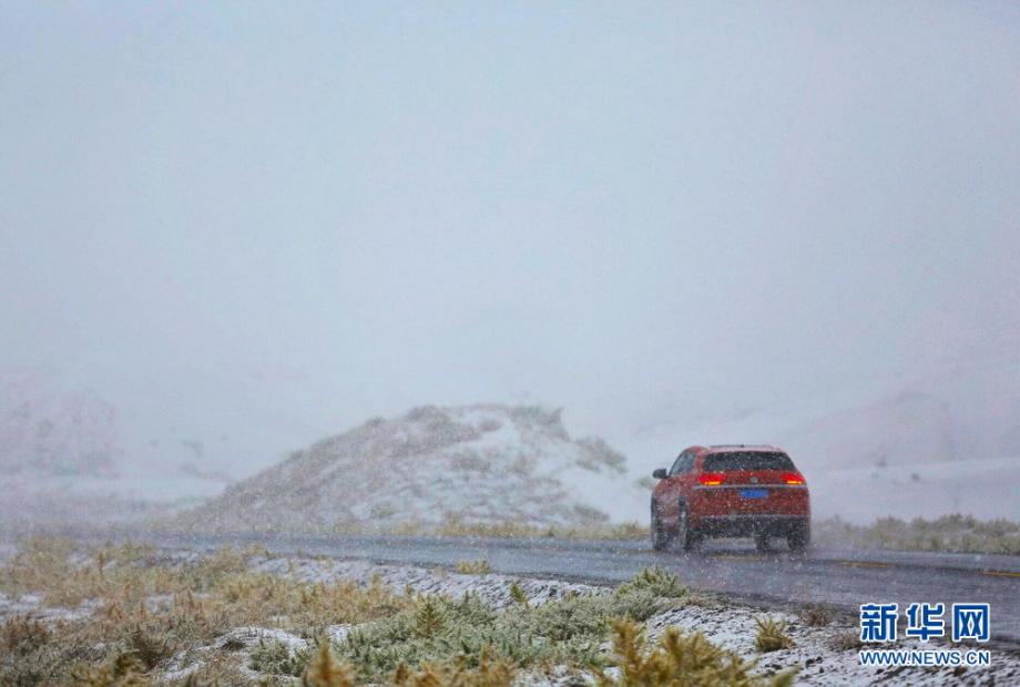 10月15日,在寧夏中衛(wèi)市沙坡頭景區(qū),汽車(chē)在大雪中行進(jìn)。新華網(wǎng)杜文杰攝