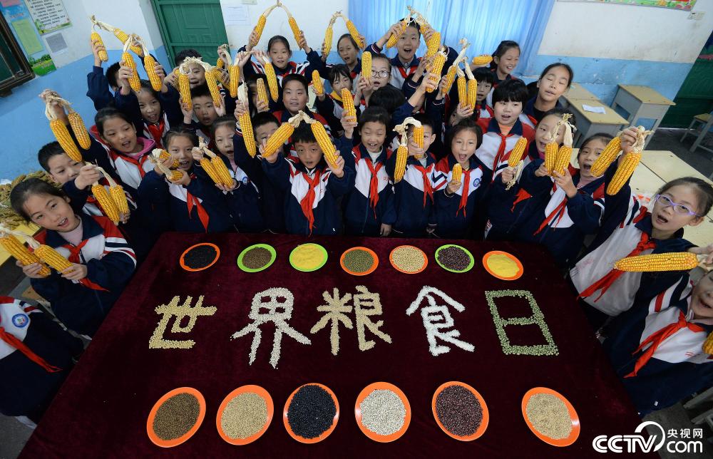 2019年10月15日,河北省邯鄲市邯山區(qū)滏河學(xué)校的學(xué)生們用糧食作物拼成“世界糧食日”字樣,呼吁大家愛糧節(jié)糧。圖片來源:視覺中國(guó)