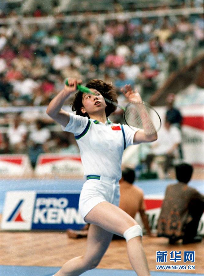 圖為韓愛(ài)萍在福州舉行的1986年“登喜路”中國(guó)羽毛球公開(kāi)賽女子單打決賽中擊球(1986年6月1日攝),她最終奪得女單冠軍。新華社記者官天一攝