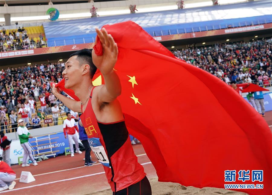 10月24日,中國選手王嘉男在比賽后慶祝。 當(dāng)日,在武漢舉行的第七屆世界軍人運動會田徑項目男子跳遠(yuǎn)決賽中,中國選手王嘉男、黃常洲分別以8米15和8米12的成績獲得冠亞軍。 新華社記者金良快攝
