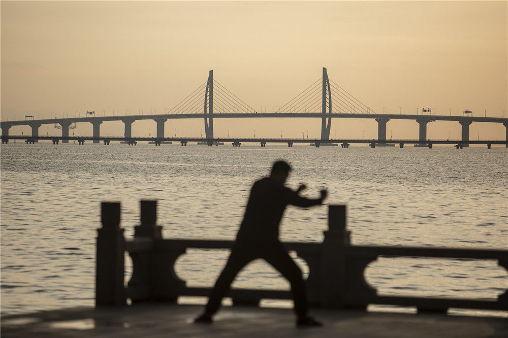 10月24日,晨起的澳門市民在海邊跑步。2018年10月23日,港珠澳大橋正式開通。新華社記者張金加攝