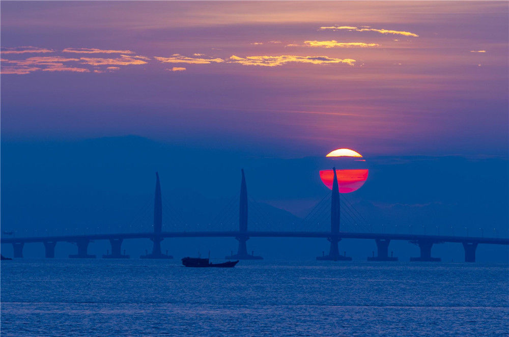 2018年10月22日早晨,從廣東珠海市的情侶路向東眺望,一輪紅日從東方冉冉升起,將港珠澳大橋映射得格外迷人。“超級工程”港珠澳大橋將于24日上午9時正式通車。張煒(香港分社)/中新社/視覺中國