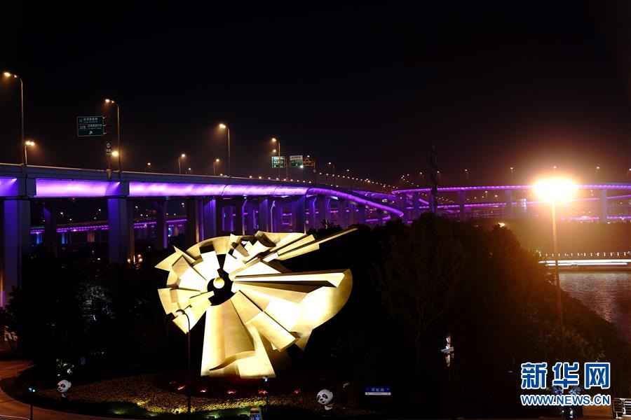 10月25日晚在國(guó)家會(huì)展中心(上海)周邊地區(qū)拍攝的“玉蘭花開(kāi)”燈飾。