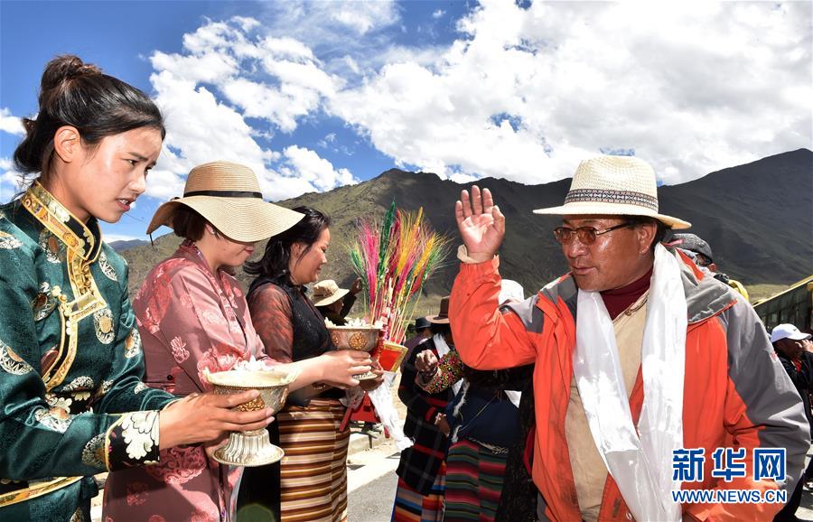 向來自遠(yuǎn)方的新鄰居敬獻(xiàn)青稞酒(2018年6月18日攝)。經(jīng)過兩天的馳騁,11輛大巴和31輛大貨車緩緩駛?cè)肜_市堆龍德慶區(qū)古榮鄉(xiāng)嘎沖村,標(biāo)志著西藏首個(gè)高海拔生態(tài)搬遷項(xiàng)目正式實(shí)施。新華社記者覺果攝