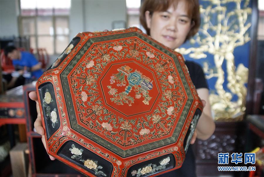 北京金漆鑲嵌有限責任公司的技師在制作漆藝制品(10月31日攝)。新華社記者李欣攝
