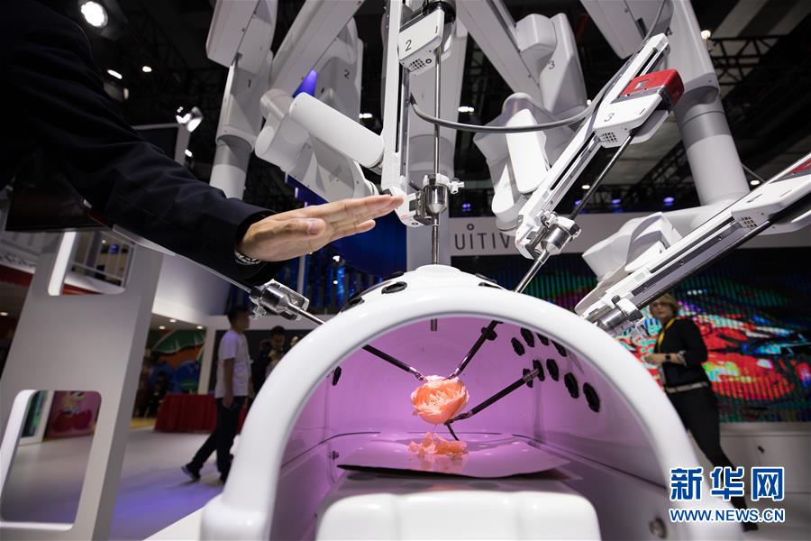 這是在第二屆進博會醫(yī)療器械及醫(yī)藥保健展區(qū)拍攝的機器人輔助腹腔鏡手術(shù)系統(tǒng)(11月7日攝)。新華社記者金立旺攝