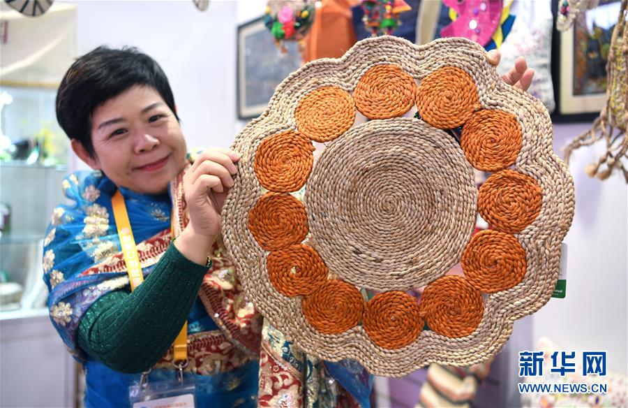在第二屆進博會品質(zhì)生活展區(qū),孟加拉國達(dá)達(dá)公司工作人員展示黃麻制品(11月8日攝)。新華社記者范培珅攝