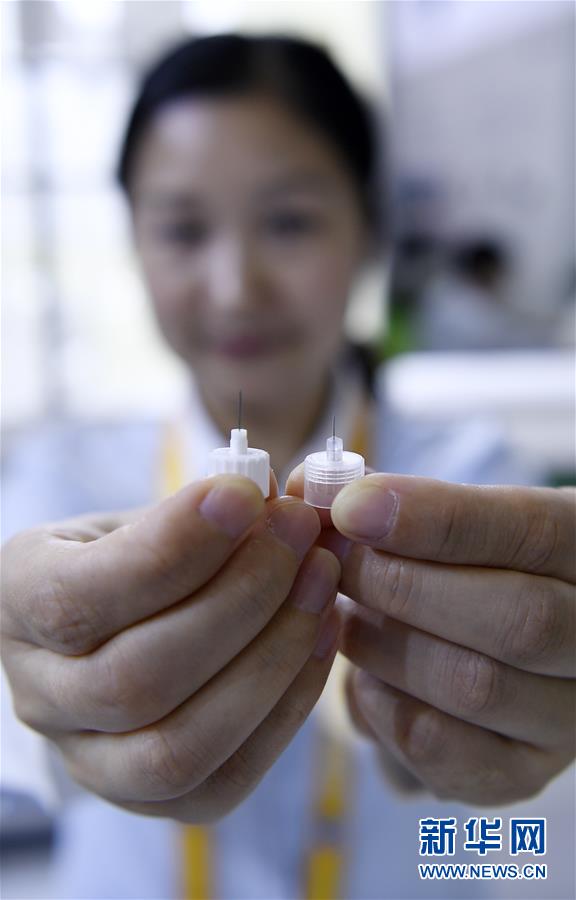 在第二屆進博會醫(yī)療器械及醫(yī)藥保健展區(qū),工作人員展示全球最細(xì)胰島素注射針頭“納諾斯Jr.”(右)與普通針頭的對比(11月7日攝)。新華社記者王鵬攝