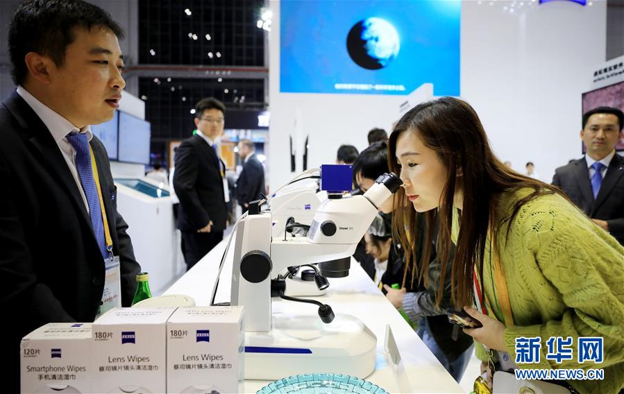 在第二屆進博會裝備展區(qū)德國蔡司公司展臺,參觀者體驗一款數(shù)碼互動教學(xué)系統(tǒng)產(chǎn)品(11月8日攝)。新華社記者方喆攝