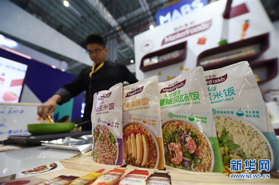 這是在第二屆進博會瑪氏公司展臺拍攝的“我的食刻”方便米飯產(chǎn)品(11月7日攝)。新華社記者尹炣攝