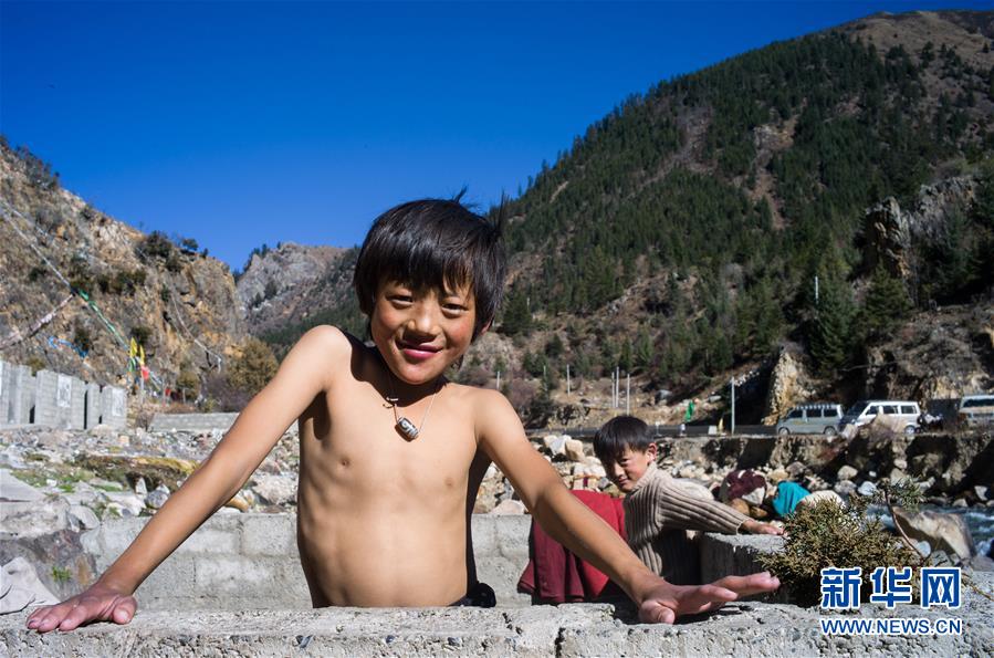 在318國道邊的四川巴塘縣德達(dá)溫泉,小朋友在沐?。?0月18日攝)。新華社記者江宏景攝
