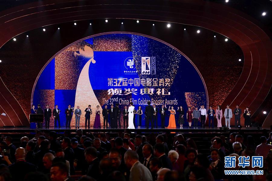 11月23日,獲獎?wù)咴陬C獎典禮上合影。當(dāng)日,第32屆中國電影金雞獎頒獎典禮在福建廈門舉行。新華社記者姜克紅攝