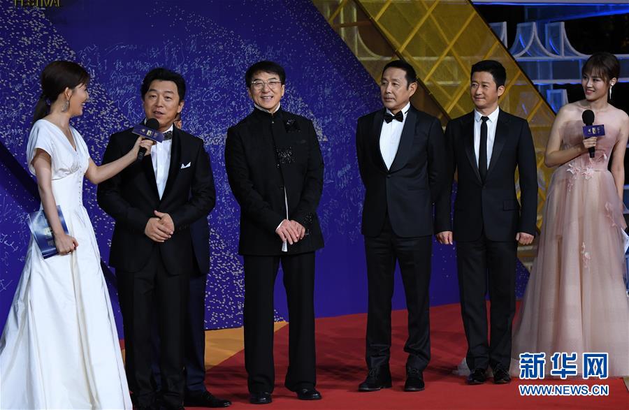 11月23日,黃渤、成龍、陳道明、吳京(左二起)在紅毯儀式上。當(dāng)日,第28屆中國(guó)金雞百花電影節(jié)紅毯儀式在福建廈門(mén)舉行。新華社記者張國(guó)俊攝