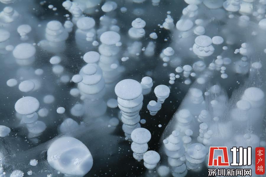 透過晶瑩剔透的冰面,可以看到一串串潔白氣泡分布在冰層中。