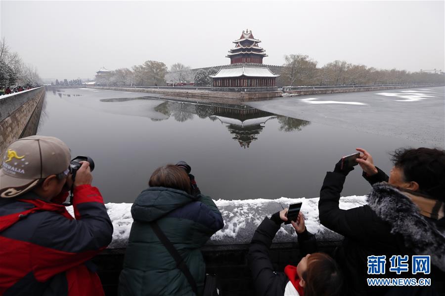11月30日,人們在雪后的故宮角樓附近拍照。  新華社記者 沈伯韓 攝