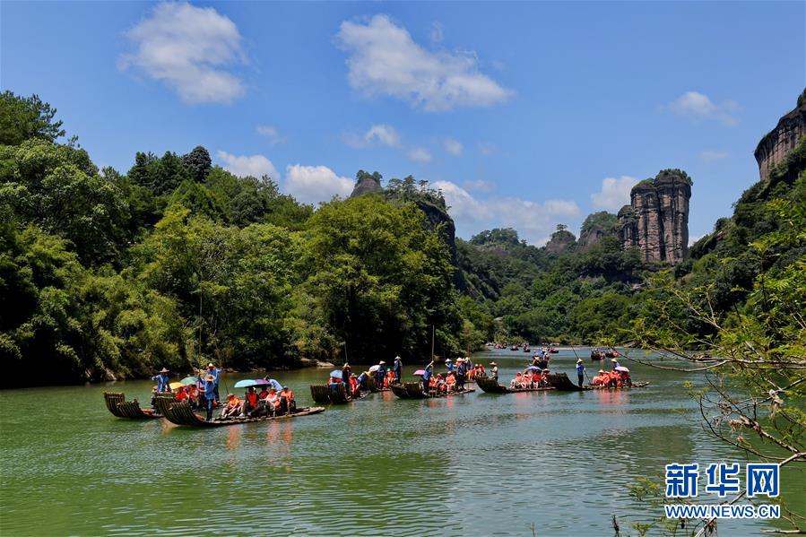 游客在武夷山九曲溪上漂流(8月4日攝)。新華社記者張國(guó)俊攝