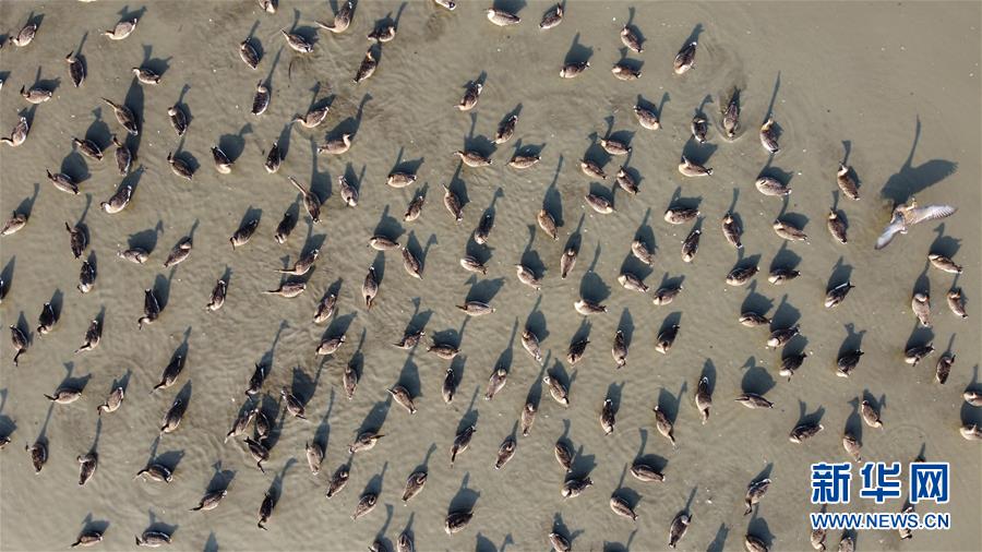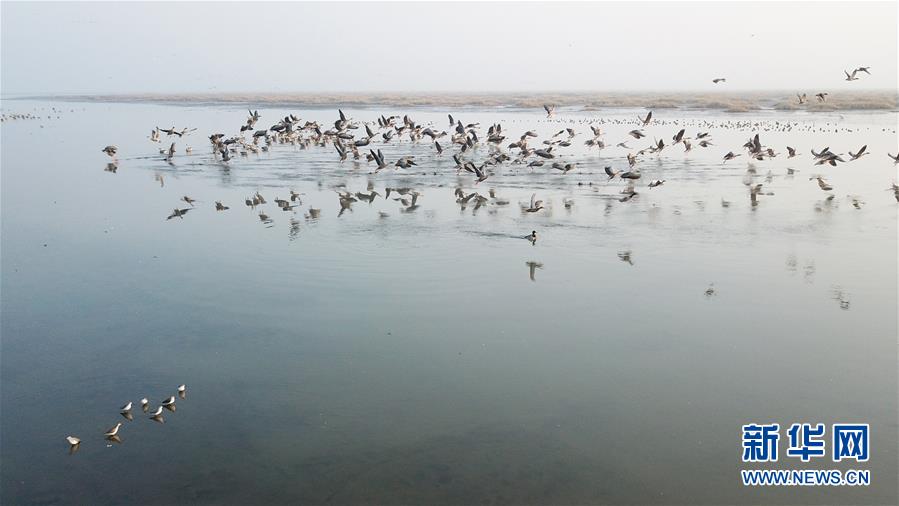 12月7日,一群候鳥在升金湖停留(無(wú)人機(jī)拍攝)。新華社記者張端攝
