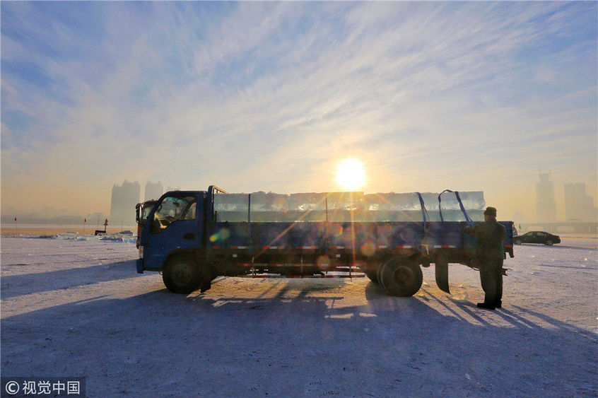 2018年12月11日,黑龍江省哈爾濱市,松花江上,采冰者們彎腰拉繩,宛如纖夫般拽重達半噸的冰塊出水。采冰者都是自哈市江北萬寶、東發(fā)、沙陀子等鄉(xiāng)鎮(zhèn)的農(nóng)民,他們每年冬閑時都會親屬、村鄰之間結(jié)伴到松花江畔采冰,有的采冰人,已經(jīng)連續(xù)干了二十多年。每個采冰季,他們每天要在冰面上工作10-12個小時,每個采冰組,一天要拽出冰塊2000-3000塊,一個近20天的采冰季,每人能收入近萬元。