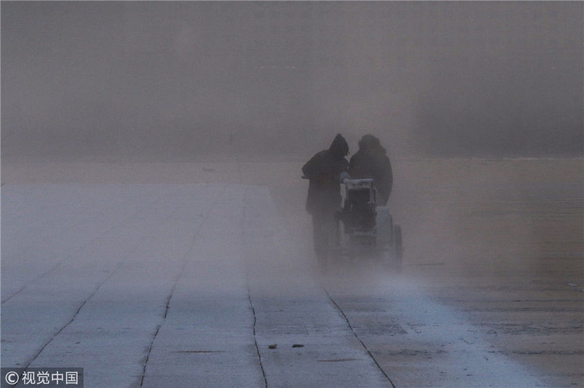 2018年12月11日,黑龍江省哈爾濱市,松花江上,采冰者們彎腰拉繩,宛如纖夫般拽重達(dá)半噸的冰塊出水。采冰者都是自哈市江北萬(wàn)寶、東發(fā)、沙陀子等鄉(xiāng)鎮(zhèn)的農(nóng)民,他們每年冬閑時(shí)都會(huì)親屬、村鄰之間結(jié)伴到松花江畔采冰,有的采冰人,已經(jīng)連續(xù)干了二十多年。每個(gè)采冰季,他們每天要在冰面上工作10-12個(gè)小時(shí),每個(gè)采冰組,一天要拽出冰塊2000-3000塊,一個(gè)近20天的采冰季,每人能收入近萬(wàn)元。視覺(jué)中國(guó)