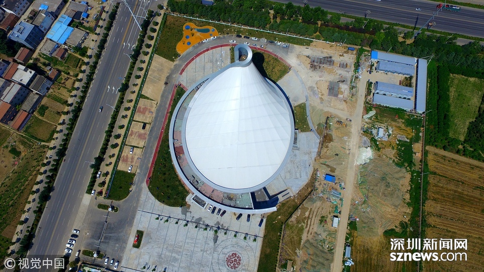 2018年6月13日,航拍河南淮陽(yáng)一座即將竣工落成的體育場(chǎng)館建筑,市民稱酷似一個(gè)石磨盤。
