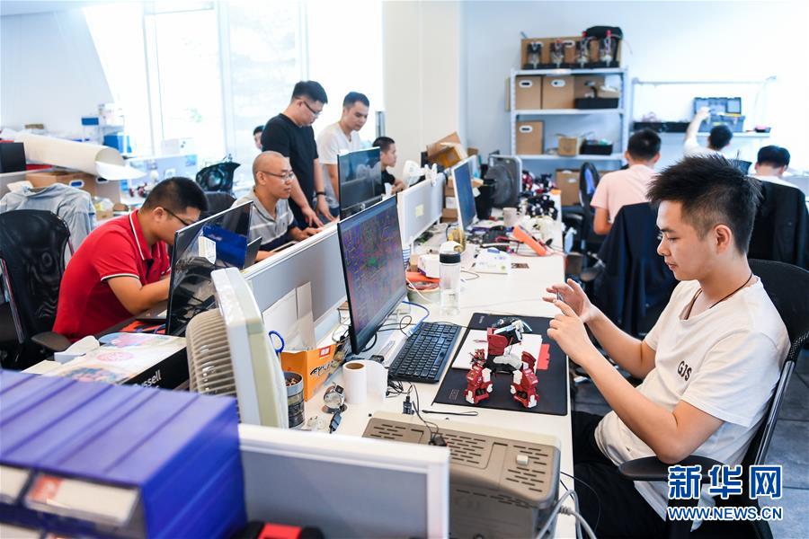 在深圳前海深港青年夢工場,創(chuàng)業(yè)者招俊?。ㄇ坝遥┡c團(tuán)隊(duì)成員在辦公室工作(2018年10月25日攝)。 新華社記者 毛思倩 攝