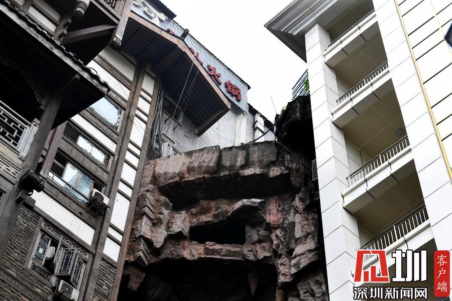 2019年10月24日,重慶渝中區(qū),兩棟樓房中間就是斷崖,斷崖上面是車(chē)來(lái)車(chē)往的滄白路,而下方則是人來(lái)人往的洪崖洞景區(qū),給人一種魔幻8D既視感,引發(fā)外地游客感嘆。